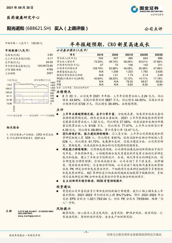阳光诺和在2021年上半年展现出作为CRO行业新星的强劲增长势头,其营业收入和归母净利润均实现超预期增长,尤其在临床试验和生物分析服务领域表现突出。公司通过持续的团队扩张、研发能力提升以及丰富的订单储备,不断巩固其在药物发现、药学研究、临床试验和生物分析等核心业务领域的竞争力。鉴于其高速成长和良好的发展前景,分析师上调了公司未来三年的盈利预测并维持“买入”评级。然而,投资者仍需关注包括解禁、核心技术人员流失、监管及市场波动等多方面潜在风险。