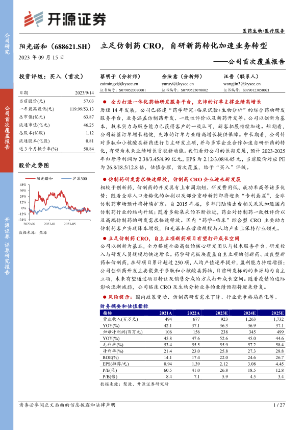 历经14年发展,公司已搭建“药学研究+临床试验+生物分析”的综合药物研发服务平台,业务涵盖仿制药开发、一致性评价以及新药开发等。公司以创新为基本,技术实力与服务能力已获得客户的一致认可,新客拓展持续加速。短期看,公司新签订单增长稳健,充沛的订单为业绩高增长提供保障。中长期看,公司针对多肽和小核酸类新药进行自主研发立项,并与多家企业合作加速自研新药的转化,有望为未来业绩增长贡献新动能。我们看好公司的长期发展,预计2023-2025年归母净利润为2.38/3.45/4.99亿元,EPS为2.12/3.08/4.45元,当前股价对应PE为26.8/18.5/12.8倍,估值合理,首次覆盖,给予“买入”评级。