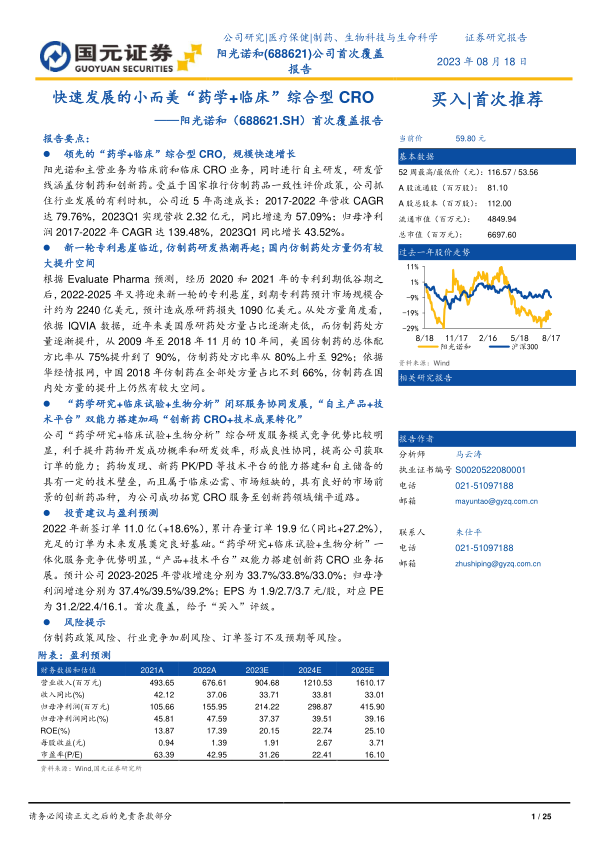 阳光诺和作为一家快速成长的“药学+临床”综合型CRO企业,在仿制药市场政策红利和自身一体化服务平台的驱动下,实现了营收和利润的显著增长。公司凭借领先的研发实力、充足的订单储备和不断扩大的客户群,巩固了其在仿制药研发服务领域的市场地位。同时,公司积极通过“自主产品+技术平台”双能力搭建,布局创新药CRO及技术成果转化,自主研发管线丰富,并已开始进入权益收获期,有望为未来业绩增长提供新动力。尽管面临仿制药政策变化、行业竞争加剧和订单签订不及预期等风险,但公司当前估值具备配置价值,首次覆盖给予“买入”评级。