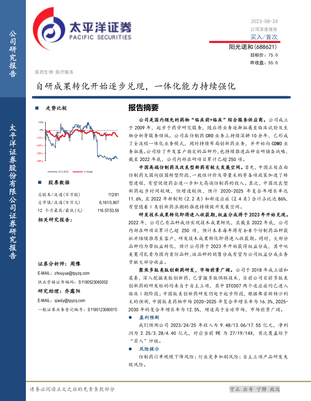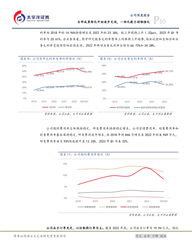 公司是国内领先的药物“临床前+临床”综合服务供应商。公司成立于2009年,起步于药学研究服务,随后将业务逐渐拓展至临床试验及生物分析等服务领域。公司在仿制药CRO业务上持续深耕10余年,已形成了全流程一体化业务模式,同时持续布局创新药业务,并开始向CDMO业务拓展。公司除了开发客户指定的品种外,也持续推进品种自研储备战略,截至2022年底,公司内部在研项目累计已超250项。