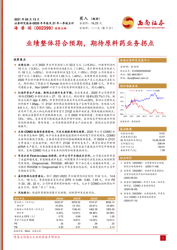 本报告分析表明,海普瑞2020年业绩符合预期,肝素全产业链布局持续深化,制剂业务占比提升,CDMO业务长期向好,创新药布局打开成长空间。预计公司2021-2023年业绩将保持增长,维持“买入”评级,但需关注依诺肝素制剂销售和创新药研发风险。