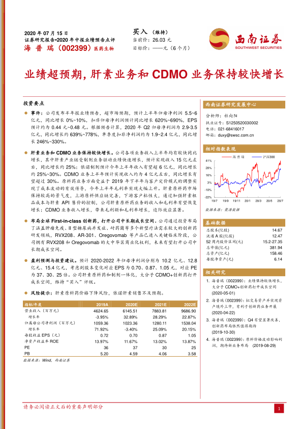 海普瑞2020年上半年业绩超预期,特别是第二季度表现强劲,主要得益于肝素业务、CDMO业务和疫苗业务的快速增长。公司在肝素产业链、CDMO以及创新药领域的布局,为其提供了坚实的增长基础和广阔的长期发展空间。生长激素作为核心业务,市场潜力巨大,而促卵泡素和鼻喷流感疫苗等重磅新品的推出,将进一步驱动未来业绩增长。尽管存在肝素价格波动、销售不及预期及研发风险,但鉴于公司业绩的高增长潜力和相对合理的估值,维持“买入”评级。