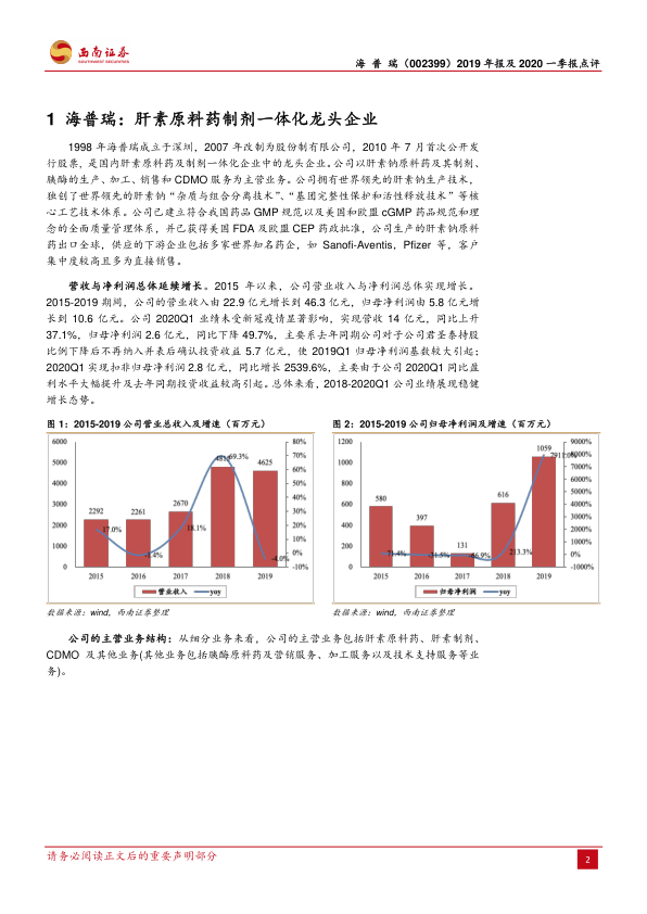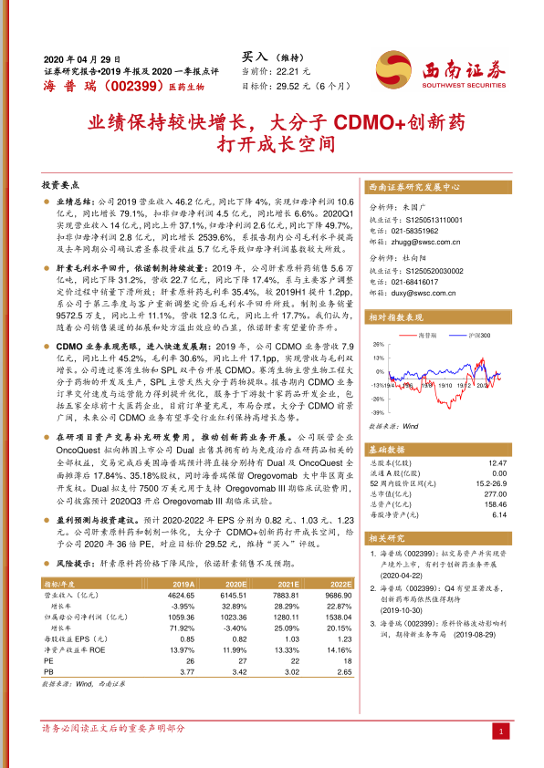本报告对海普瑞(002399)2019年报及2020年一季报进行了深入分析。公司业绩保持较快增长,盈利能力显著提升。肝素原料药业务稳定发展,依诺肝素制剂持续放量,CDMO业务进入快速发展期,创新药业务也在积极推进。综合考虑公司业务多元化和未来增长潜力,维持“买入”评级,但需关注肝素原料药价格下降和依诺肝素销售不及预期的风险。