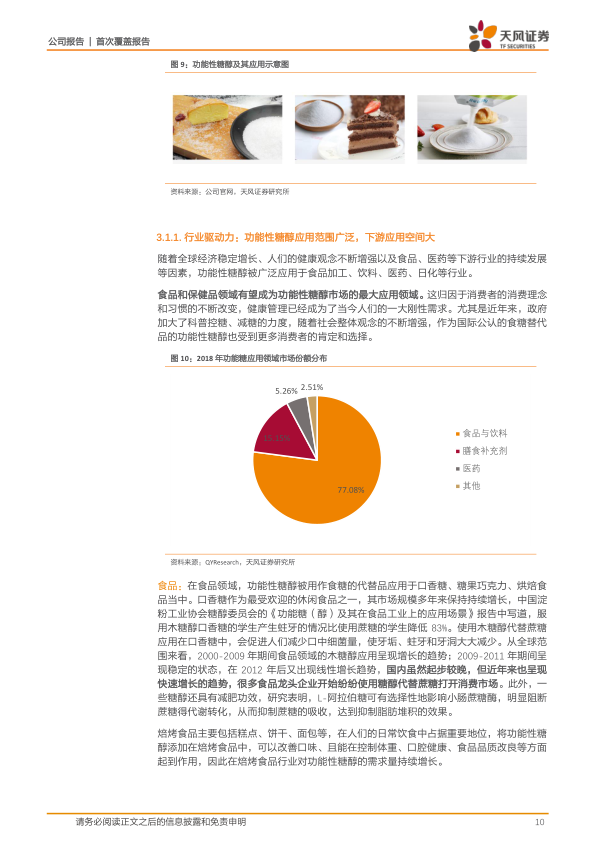 食品和保健品领域是功能性糖醇最大的应用市场,2018年77%的功能糖应用于食品饮料。消费者对健康低卡食品的需求日益增长,政府控糖减糖的科普力度加大,使得功能性糖醇作为食糖替代品受到青睐。在食品领域,功能性糖醇被用于口香糖、糖果巧克力、烘焙食品等,例如木糖醇口香糖可显著降低蛀牙发生率。L-阿拉伯糖等糖醇还具有减肥功效,能抑制蔗糖吸收。在医药领域,糖醇能影响酶活性、促进益生菌增殖、改善肝功能,并被列入多种药物名单。在日化领域,山梨糖醇、麦芽糖醇等因其吸湿保湿性,广泛应用于牙膏、化妆品等产品中,随着消费升级,日化用品品质要求的提高将进一步拉动需求。