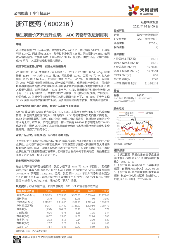 浙江医药2021年上半年业绩受益于维生素产品量价齐升,以及在ADC药物研发方面的积极进展。公司通过技术升级和产能扩张,巩固了在维生素市场的地位,同时ARX788 ADC药物的研发有望为公司带来新的增长点。维持“买入”评级,但需关注行业政策、新药研发和产品价格波动等风险。