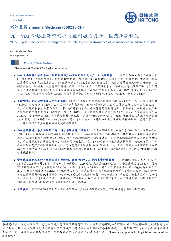 本报告分析表明,浙江医药在生命营养品、医药制造和医药商业领域均有布局。近期VE和VD3等维生素价格上涨有望提升公司盈利能力。同时,公司持续推进产品注册和项目建设,为未来发展奠定基础。然而,公司也面临宏观经济环境变化、产品价格波动以及下游市场需求不及预期等风险,投资者需谨慎评估。