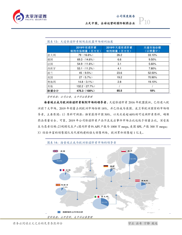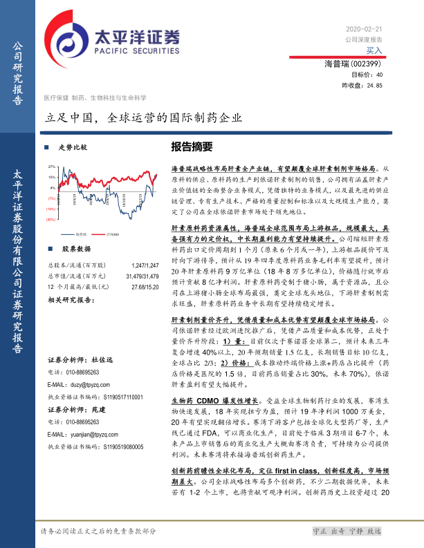 海普瑞作为全球肝素原料药绝对龙头,市场份额 40%,同时肝素制剂未来也将是全球龙头之一,生物药CDMO爆发性增长中,创新药布局前瞻。预计 19-21 年净利润分别为 8.2/10.6/13.6 亿元,同比增速 33%/29%/28%,分部估值20年合理估值500亿元,对应PE 47X,“买入”评级。