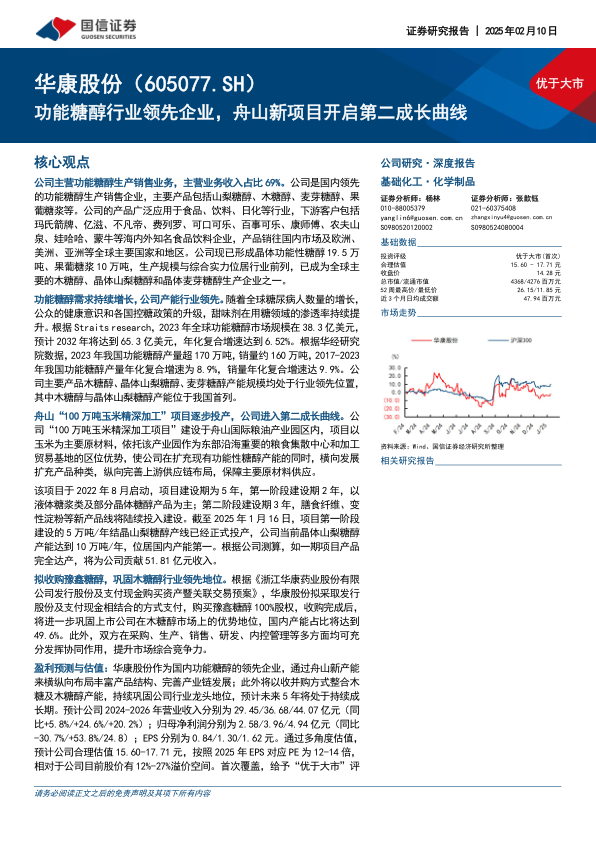 公司正通过“100万吨玉米精深加工”舟山项目和拟收购豫鑫糖醇,开启其第二成长曲线。舟山项目第一阶段的5万吨/年结晶山梨糖醇产线已于2025年1月16日正式投产,使公司晶体山梨糖醇总产能达到10万吨/年,巩固了国内领先地位。该项目完全达产后预计将为公司贡献51.81亿元收入,并横向拓展膳食纤维、阿洛酮糖等高增长潜力产品线,纵向完善上游供应链。同时,拟收购豫鑫糖醇100%股权将使公司木糖醇国内产能占比提升至49.6%,进一步巩固市场优势并发挥协同效应。报告预计公司2024-2026年营业收入将分别达到29.45/36.68/44.07亿元,归母净利润分别为2.58/3.96/4.94亿元,并首次覆盖给予“优于大市”评级,合理估值区间为15.60-17.71元。