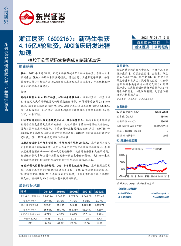 本报告分析了浙江医药控股子公司新码生物获得A轮融资的积极影响,以及公司在ADC药物研发领域的进展。同时,报告强调了维生素E市场进入量价提升阶段,有望为公司带来业绩弹性。维持“强烈推荐”评级,提示投资者关注创新药研发进展、产品价格波动及新药审批风险。