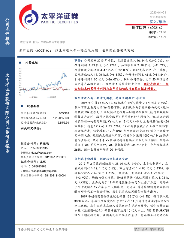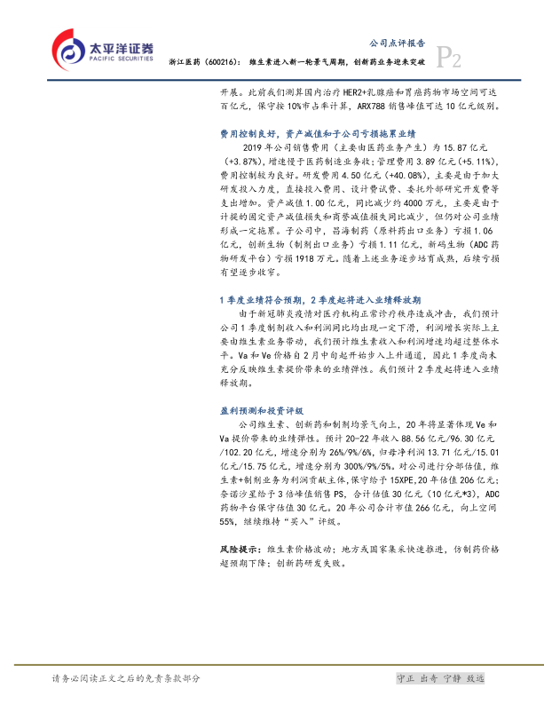 本报告对浙江医药(600216)进行了深入分析,认为公司正迎来维生素业务的新一轮景气周期,同时创新药业务也取得突破性进展。报告详细分析了公司2019年年报和2020年一季报,指出维生素E和A价格上涨将显著增厚公司利润,奈诺沙星和ARX788等创新药有望成为新的增长点。此外,报告还对公司的费用控制、资产减值、子公司亏损等情况进行了分析,并给出了盈利预测和投资评级。总体而言,报告认为浙江医药具有良好的发展前景,维持“买入”评级,但同时也提示了维生素价格波动、集采风险和创新药研发失败等风险。