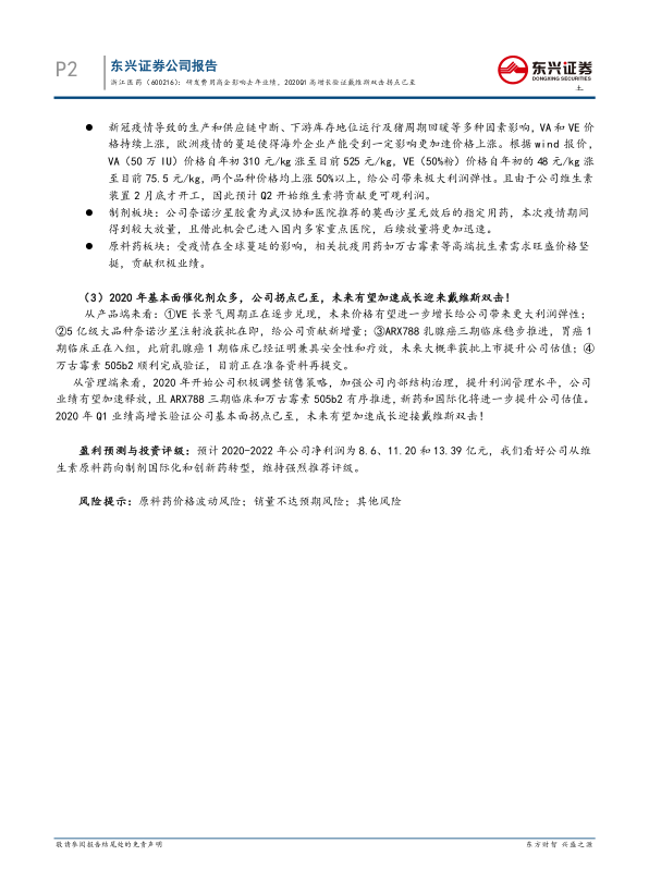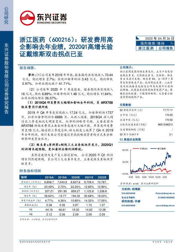浙江医药在2019年因高额研发费用计提导致业绩承压,但2020年第一季度展现出超预期的强劲增长,验证了公司基本面拐点已至。公司在维生素、原料药和制剂三大业务板块协同发力,尤其受益于维生素产品价格的持续上涨、奈诺沙星制剂的市场拓展以及创新药ARX788的稳步推进。随着管理策略的调整和内部治理的加强,公司业绩有望加速释放,并凭借新药研发和国际化战略进一步提升估值,未来有望迎来业绩增长与估值提升的“戴维斯双击”。分析师维持“强烈推荐”评级,并预计2020-2022年净利润将持续增长。