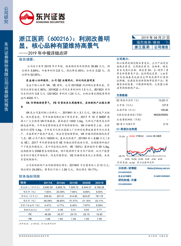 看好浙江医药从维生素原料药向制剂国际化和创新药转型,公司研发稳步推进,国际化和创新逐步落地。
