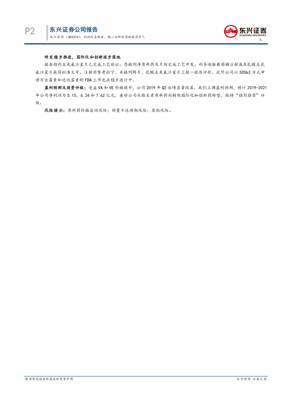 公司在制剂国际化和创新药转型方面取得积极进展,研发稳步推进,有望实现长期可持续发展。维持“强烈推荐”评级,但需关注原料药价格波动等风险。