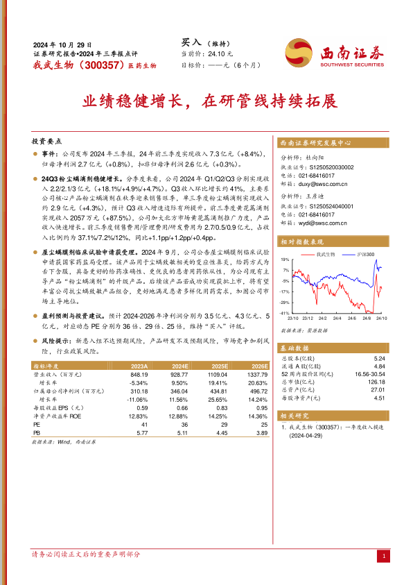 本报告通过对 我武生物2024年三季报的详细解读,认为公司业绩保持稳健增长,核心产品销售良好,新产品研发取得进展,市场地位有望进一步巩固。维持“买入”评级,并提示投资者关注相关风险。