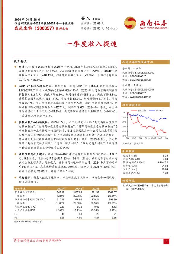 本报告对 我武生物(300357)2023年年报和2024年一季报进行了分析,并给出了投资建议。核心观点如下: