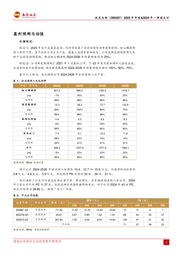 盈利预测与投资建议。预计2024-2026年归母净利润分别为3.8亿元、4.8亿元、5.9亿元,对应动态PE分别为33倍、26倍、21倍。我们选取了行业中与我武生物主营产品、商业模式、竞争格局相近的三家公司,2024年三家公司平均PE为37倍。我武生物系我国脱敏药物龙头,给予公司2024年40倍PE,对应目标价为28.80元,维持“买入”评级。