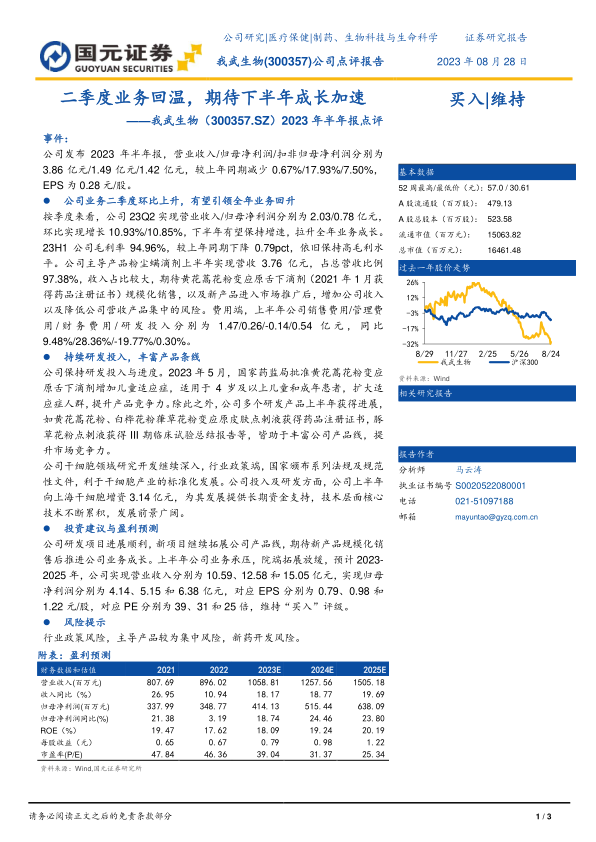 本报告分析了我武生物2023年半年报,指出公司二季度业绩回暖,全年有望加速增长。公司保持高毛利率,并通过持续的研发投入和新产品、新适应症的拓展,丰富产品线,降低营收集中风险。此外,公司在干细胞领域的研究开发也在深入进行。报告预测了公司未来三年的营收和净利润,并维持“买入”评级,同时也提示了行业政策、产品集中和新药开发等风险。