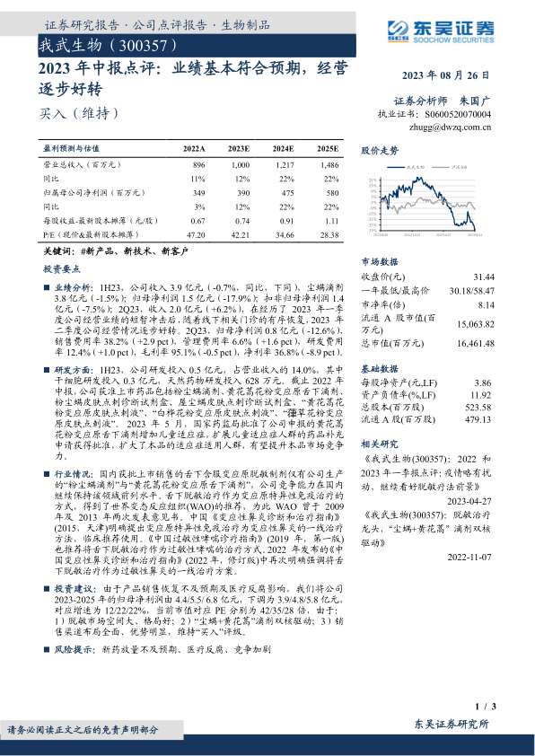 我武生物2023年上半年业绩基本符合预期,第二季度经营状况显著改善,收入实现正增长,显示出公司在面对市场挑战时的韧性与适应能力。尽管短期内受销售恢复不及预期及医疗反腐等因素影响,盈利预测有所调整,但公司核心业务的恢复态势良好。