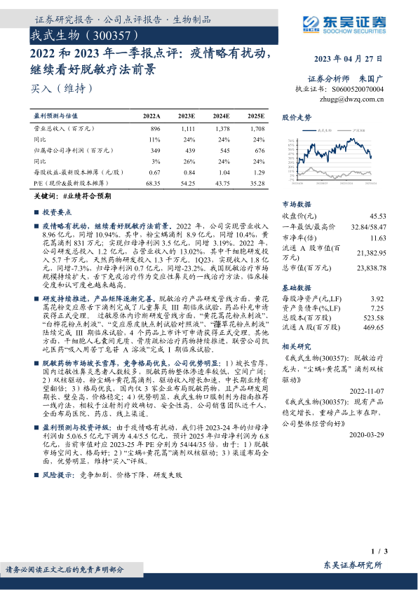 2022和2023年一季报点评:疫情略有扰动,继续看好脱敏疗法前景