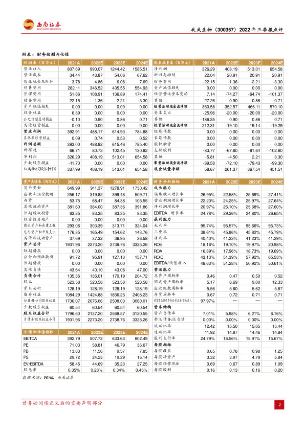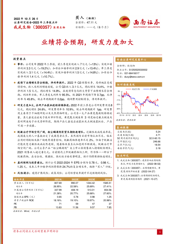 本报告分析了我武生物2022年三季报,指出公司业绩符合预期,研发力度加大,净利率有所提升。脱敏治疗市场空间广阔,粉尘螨滴剂作为公司主导产品,具有显著优势,预计将保持快速增长。维持“买入”评级,但需关注疫情扩散、政策变动以及公司经营效率等风险。