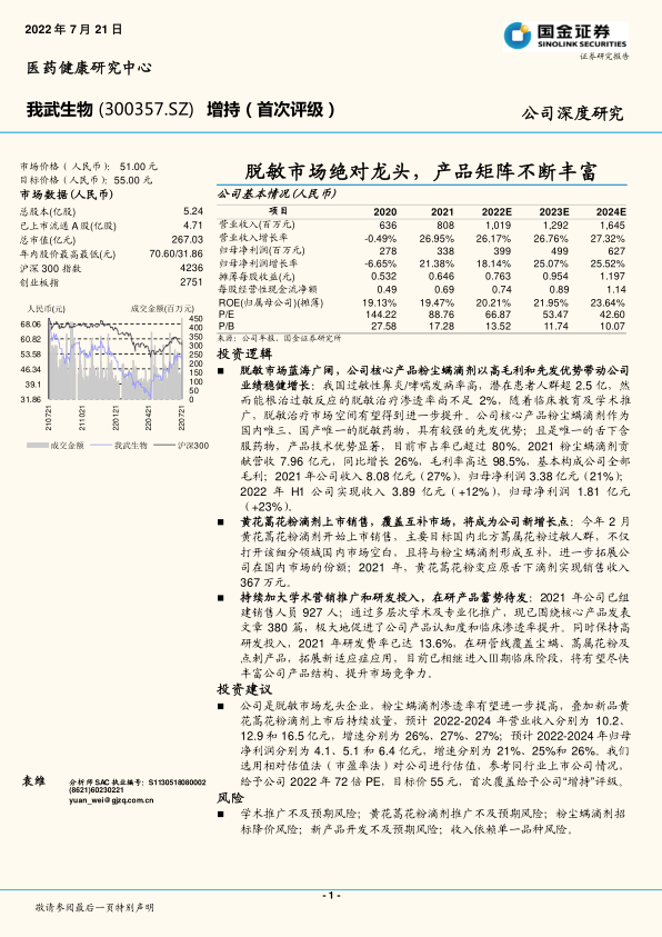 公司是脱敏市场龙头企业,粉尘螨滴剂渗透率有望进一步提高,叠加新品黄花蒿花粉滴剂上市后持续放量,预计2022-2024年营业收入分别为10.2、12.9和16.5亿元,增速分别为26%、27%、27%;预计2022-2024年归母净利润分别为4.1、5.1和6.4亿元,增速分别为21%、25%和26%。我们选用相对估值法(市盈率法)对公司进行估值,参考同行业上市公司情况,给予公司2022年72倍PE,目标价55元,首次覆盖给予公司“增持”评级。