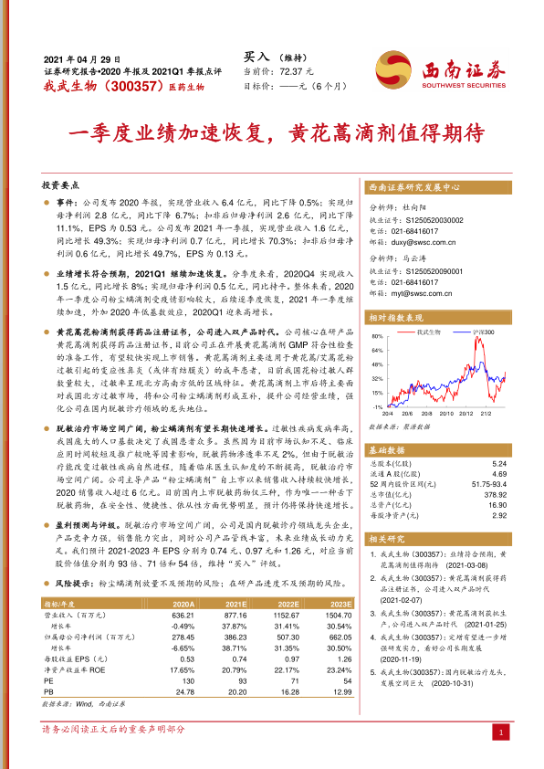 我武生物在2020年及2021年一季度表现出显著的业绩复苏和增长势头,尤其是一季度业绩加速恢复并超出市场预期。公司核心产品粉尘螨滴剂持续放量,新产品黄花蒿滴剂的获批上市,标志着公司进入双产品时代,将进一步巩固其在国内脱敏诊疗领域的龙头地位。脱敏治疗市场广阔且渗透率低,为公司提供了巨大的成长空间。尽管存在产品放量和研发进度不及预期的风险,但公司丰富的产品管线和强大的市场竞争力,使其未来业绩成长动力充足,维持“买入”评级。