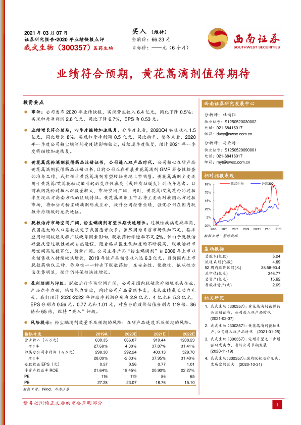 我武生物2020年业绩符合预期,展现出稳健的增长态势,尤其在第四季度加速恢复。公司核心产品粉尘螨滴剂持续贡献主要营收,并有望保持长期快速增长。