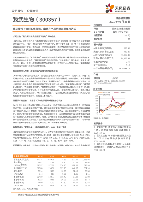 公司作为国内脱敏治疗领域的龙头企业,研发管线不断推进将持续夯实其市场地位。考虑到疫情对公司产品销售推广的影响,报告略微下调了2020年业绩预期。预计公司2020-2022年归母净利润分别为3.38亿元、4.46亿元、5.82亿元(原预测为3.73亿元、4.91亿元、6.41亿元),对应EPS分别为0.65元、0.85元、1.11元,对应PE分别为115倍、87倍、67倍。报告维持“增持”评级。主要风险提示包括研发进度、结果低于预期;新产品销售低于预期;政策风险;公共安全事件风险。