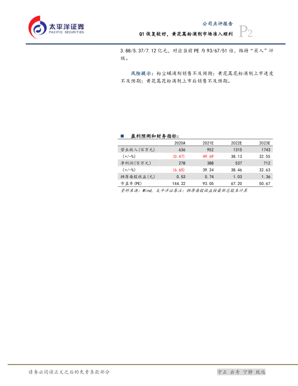 重磅新品黄花蒿粉滴剂挂网进展顺利,维持“买入”评级。公司重磅新品黄花蒿粉滴剂上市后挂网进展顺利。我们预计上市后定价将高于粉尘螨滴剂,有望形成公司另一大支柱产品,提升脱敏治疗在我国北方市场的渗透率。公司作为国内脱敏制剂行业领导者,持续助力各地重磅临床数据发表,推进粉尘螨滴剂进入多个临床指南,有望形成以学术研究带动销售、销售促进学术研究的良好循环。我们看好脱敏疗法领域以及公司的长期发展趋势。预计21-23年归母净利润为3.88/5.37/7.12亿元,对应当前PE为93/67/51倍,维持“买入”评级。