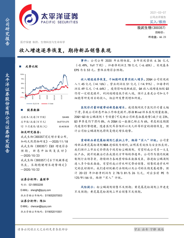 本报告对 我武生物(300357) 进行了公司点评,认为公司2020年业绩符合预期,Q4收入端增速相较Q3有所提升,但利润端增速低于收入端,主要是由于公司加大干细胞等研发项目的投入,相应研发费用增加所致。同时,医院诊疗量回暖带动新患数增长,重磅新品黄花蒿粉滴剂已获批上市,预计上市后定价将高于现有粉尘螨滴剂,有望形成公司另一大支柱产品,提升脱敏治疗在我国北方市场的渗透率。维持“买入”评级。