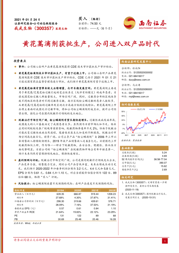 我武生物凭借其在脱敏治疗领域的深厚积累和创新能力,正迎来新的发展机遇。黄花蒿滴剂的获批生产,标志着公司进入双产品驱动增长的新阶段,将有效拓展其在花粉过敏市场的份额。同时,公司核心产品粉尘螨滴剂在广阔的脱敏治疗市场中持续保持领先地位,为公司提供了稳定的业绩支撑。尽管面临在研产品进度和产品放量不及预期的风险,但公司强劲的财务表现、健康的资本结构以及持续丰富的产品管线,共同支撑了其未来的高增长潜力。综合来看,我武生物作为国内脱敏诊疗领域的龙头企业,具备长期投资价值,维持“买入”评级。