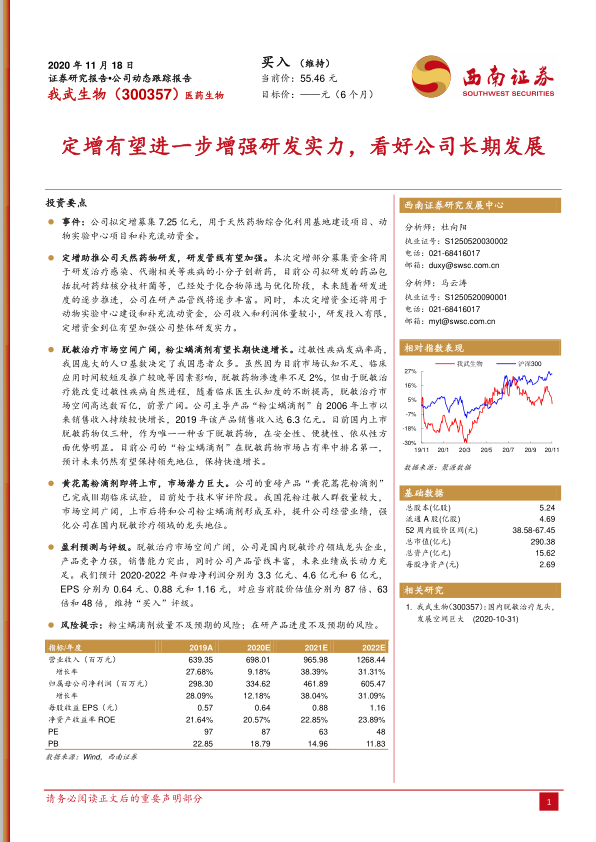 本报告认为,我武生物通过定增有望进一步增强研发实力,在脱敏治疗领域具有龙头地位和广阔市场空间,生长激素等其他重磅品种也将陆续推出,业绩增长确定性强,维持“买入”评级。同时,报告也提示了相关风险,建议投资者关注。