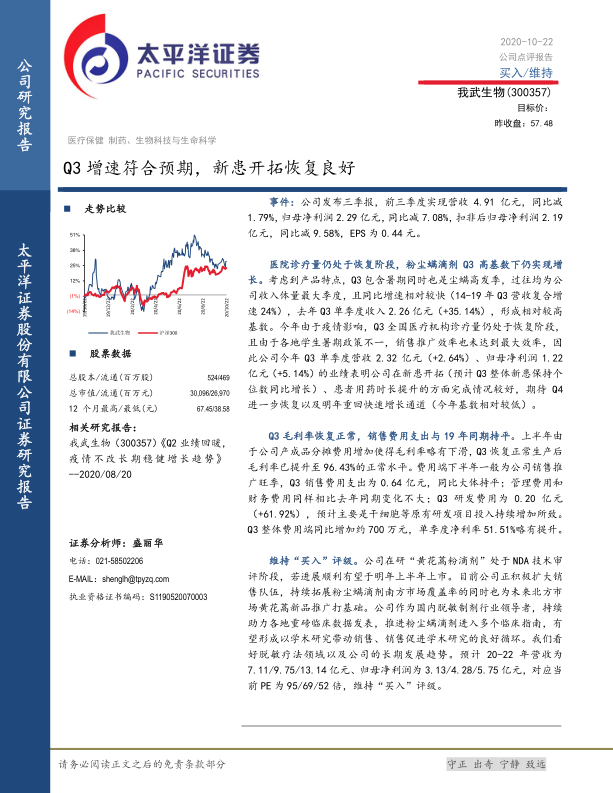本报告主要分析了我武生物(300357)2020年第三季度业绩,指出:
