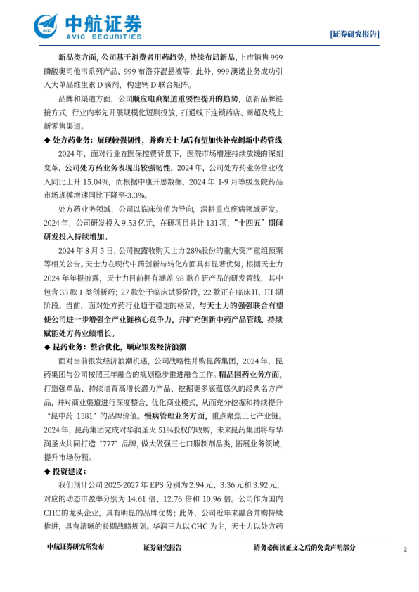 我们预计公司2025-2027年EPS分别为2.94元、3.36元和3.92元,对应的动态市盈率分别为14.61倍、12.76倍和10.96倍。公司作为国内CHC的龙头企业,具有明显的品牌优势;此外,公司近年来融合并购持续推进,具有清晰的长期战略规划。华润三九以CHC为主,天士力以处方药为核心业务做中药创新药龙头,昆药以三七以及精品国药为核心业务做银发健康产业引领者,未来三个方向或将协同助力公司业绩增长。首次覆盖,给予买入评级。