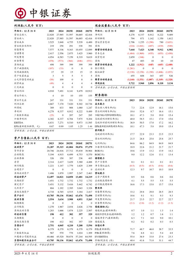 我们维持预测公司25-26年归母净利润为67.04、79.75亿元,预测2027年公司归母净利润为92.04亿元,对应EPS分别为1.05、1.25、1.44元,截至到4月11日收盘,公司25-27年对应PE分别为46.0、38.7、33.5X,公司作为行业龙头,我们看好公司的行业地位以及平台管线,维持买入评级。