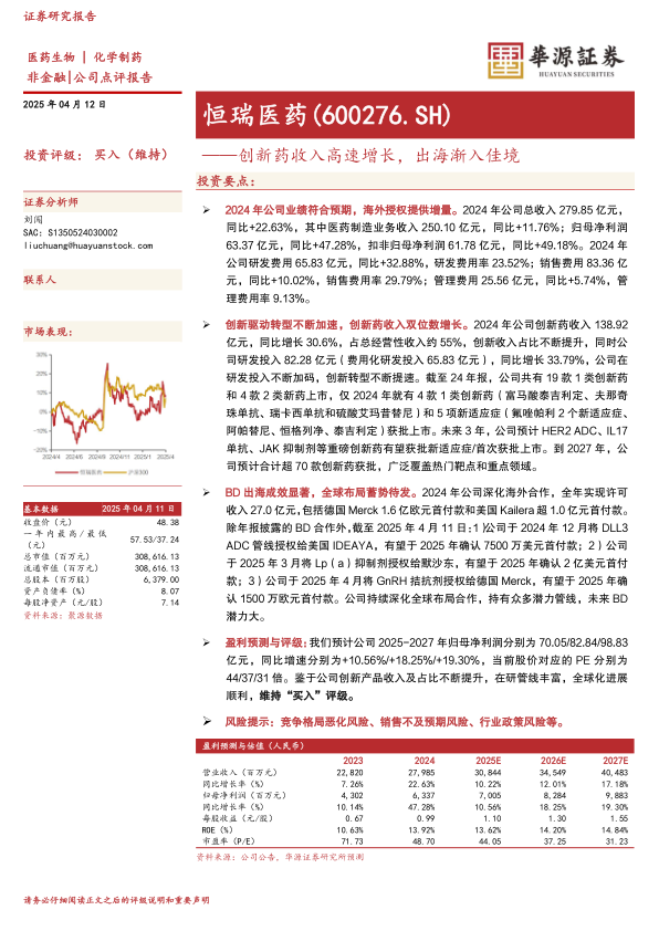 恒瑞医药2024年业绩表现亮眼,创新药收入占比持续提升,海外BD合作取得显著进展。公司通过加大研发投入和深化全球合作,不断加速创新转型,为未来的可持续增长奠定了坚实基础。