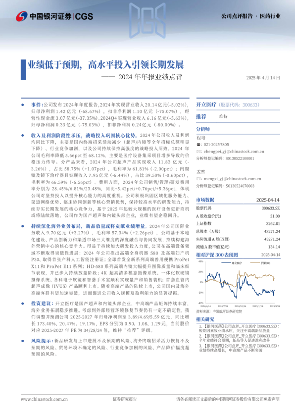 投资建议:开立医疗是国产超声和内镜头部企业,中高端产品矩阵持续丰富,海外业务拓展稳步推进。考虑到外部经营环境修复节奏仍有一定不确定性,我们调整并预测公司2025-2027年归母净利润预测至3.89/4.69/5.59亿元,同比增长173.40%、20.47%、19.17%,EPS分别为0.90、1.08、1.29元,当前股价对应2025-2027年PE为34/28/24倍,维持“推荐”评级。