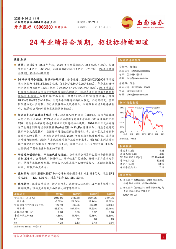 开立医疗2024年业绩受到外部环境影响,但公司积极应对,加大研发投入,推动产品创新,并在高端超声和兽用超声市场取得进展。预计未来随着医疗设备以旧换新政策的落地和反腐常态化,公司业绩有望回升。报告给出了未来三年的盈利预测,并提示了相关风险。