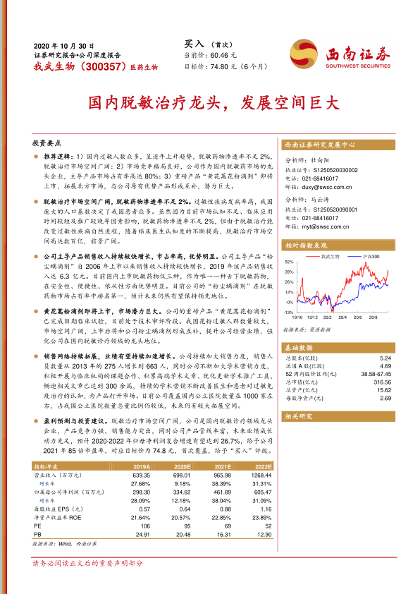 盈利预测与投资建议。脱敏治疗市场空间广阔,公司是国内脱敏诊疗领域龙头企业,产品竞争力强,销售能力突出,同时公司产品管线丰富,未来业绩成长动力充足,预计 2020-2022 年归母净利润复合增速有望达到 26.7%,给予公司2021 年 85 倍市盈率,对应目标价为 74.8 元,首次覆盖,给予“买入”评级。