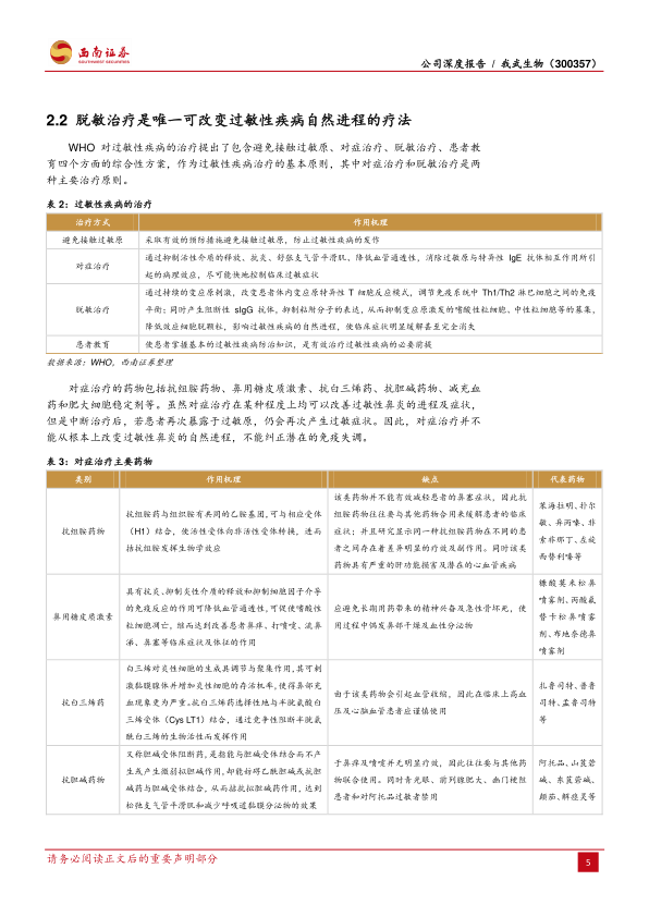 过敏性疾病是一类复杂的免疫系统疾病,主要包括过敏性鼻炎和过敏性哮喘等,其发病机理复杂且具有遗传倾向。世界卫生组织(WHO)提出了包括避免接触过敏原、对症治疗、脱敏治疗和患者教育在内的综合性治疗方案。对症治疗主要通过药物缓解症状,如抗组胺药、鼻用糖皮质激素等,但其缺点在于无法从根本上改变过敏性疾病的自然进程,停药后症状易复发。
