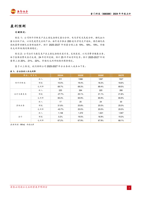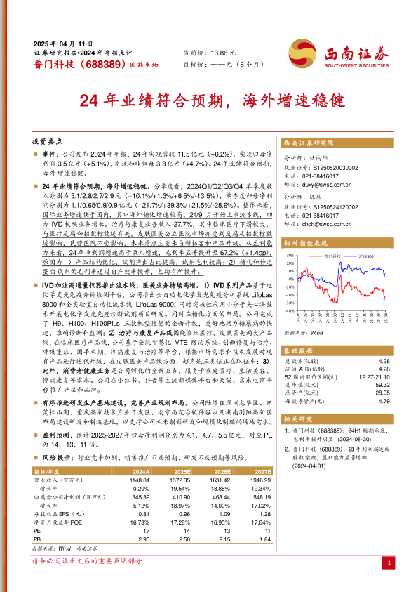 普门科技2024年年报显示,公司业绩符合预期,归母净利润实现5.1%的增长,且盈利能力显著提升,毛利率达到67.2%。这主要得益于产品结构优化和试剂自产效率的提高。国际业务和IVD板块表现稳健,特别是海外糖化业务增速较高,IVD高通量流水线的推出为未来增长注入动力。尽管治疗与康复业务受政策影响短期承压,但皮肤医美在民营市场及新产品取证方面展现潜力。公司通过多地研发生产基地建设,持续完善产业布局,为长期发展奠定基础。展望未来,公司预计2025-2027年归母净利润将持续增长,但需密切关注行业竞争、销售推广及研发进展等潜在风险。