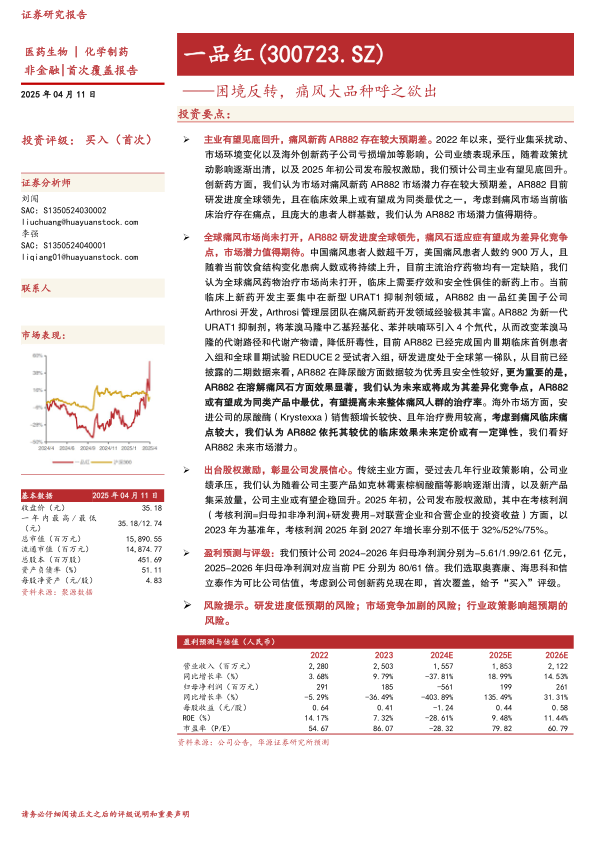 本报告对一品红(300723.SZ)进行了首次覆盖,给予“买入”评级。报告指出,公司主营业务在经历短期承压后,有望随着政策扰动出清和股权激励的推动而企稳回升。更重要的是,公司在痛风创新药AR882方面展现出巨大的市场潜力。AR882研发进度全球领先,在临床试验中表现出优异的降尿酸和溶解痛风石效果,且安全性良好,有望成为同类最优产品。鉴于全球痛风患者基数庞大、现有治疗方案存在痛点以及国内主流痛风药已受集采影响,AR882未来市场空间广阔。尽管公司2024年预计亏损,但随着创新药的兑现和主业的恢复,预计2025-2026年归母净利润将实现显著增长。投资者需关注研发进度、市场竞争及行业政策变化等风险。