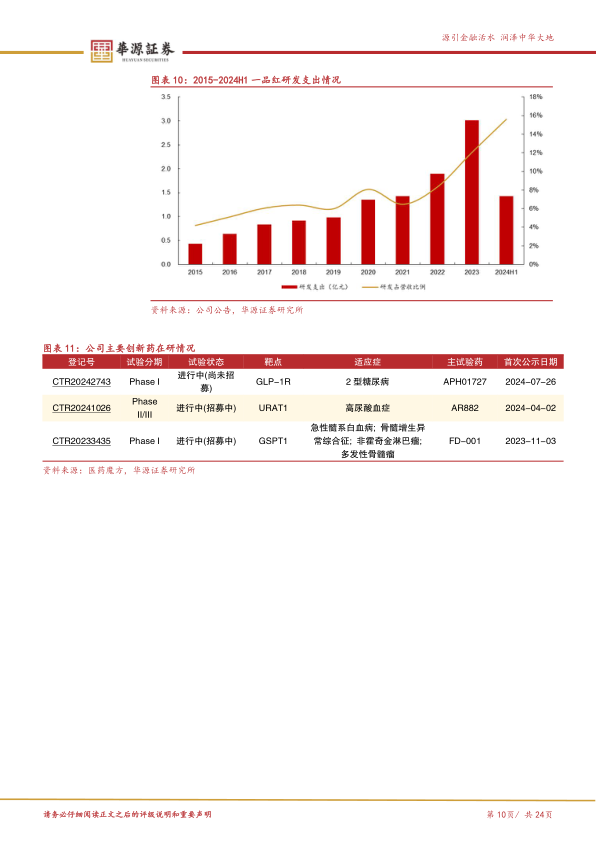 公司主要产品包括独家剂型克林霉素棕榈酸酯分散片等,其他产品通过集采逐步放量。近年来,公司研发支出持续增加,2024年上半年研发投入达1.4亿元,占营收比例约15.6%。在创新药方面,痛风创新药AR882在国内处于临床II/III期阶段,治疗糖尿病的小分子激动剂APH01727和双靶点分子胶新药FD-001均处于临床I期阶段。