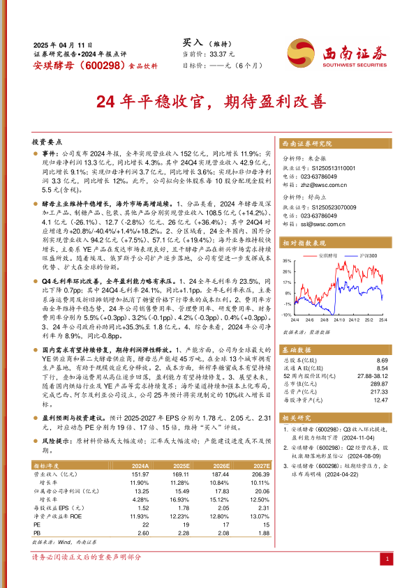 安琪酵母2024年业绩表现稳健,海外市场增长迅速,但盈利能力受到成本因素影响略有下降。公司通过产能扩张、成本控制和市场拓展,有望在未来实现利润弹性释放。报告维持“买入”评级,并提示投资者关注相关风险。