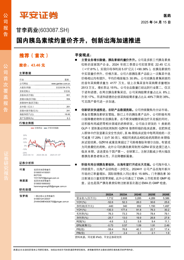 同时,甘李药业积极拓展全球市场,通过EMA GMP检查,为产品进入欧洲市场奠定基础,并与山德士合作布局欧美市场,在新兴市场也取得了实质性进展,海外业务有望成为公司新的成长引擎。尽管面临集采、政策、研发和市场竞争等多重风险,但公司凭借其核心竞争力、创新能力和全球化战略,预计未来业绩将持续高速增长。平安证券研究所首次覆盖给予“推荐”评级,认为公司估值低于可比公司均值,具备显著的投资价值。