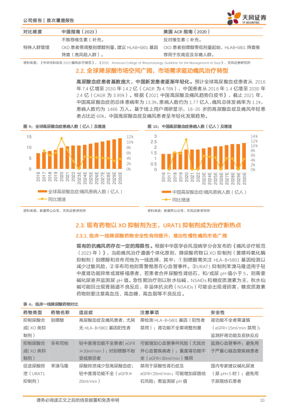 痛风是一种单钠尿酸盐沉积在关节所致的晶体相关性关节病,其与嘌呤代谢紊乱和/或尿酸排泄减少所致的高尿酸血症直接相关。预计2025年全球高尿酸血症患者将达到11.8亿,并将于2030年达到14.2亿;预计2025年中国高尿酸血症患者将达到2.1亿,并将于2030年达到2.4亿。痛风患者基数庞大,但现有痛风治疗药物存在一定的局限性。例如传统的降尿酸药物别嘌醇和非布司他,别嘌醇需关注HLA-B*5801基因检测以减少不良反应风险,非布司他则需警惕潜在心血管事件,其也因此被FDA黑框警告。因此现有药物无法充分满足痛风患者的临床需求,痛风患者需要新型的、疗效和安全性更好的药物。