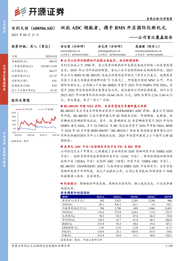百利天恒成立于1996年,是以化学仿制药和中成药业务起步的第一批民营医药企业。2010年公司开始创新转型,尝试小分子创新药物和生物药的研发。2023年公司与BMS就BL-B01D1达成全球重磅合作协议(首付8亿美元、近期或有付款5亿美元及潜在里程碑付款71亿美元),研发能力得到MNC认可,开启国际化新纪元。公司核心产品BL-B0ID1有望于2025年向NMPA申报NDA,有望于2026年迎来创新药业务商业化元年。我们看好公司的长期发展,预计公司2025-2027年归母净利润为-9.05/-10.66/-26.91亿元,EPS分别为-2.26/-2.66/-6.71元,首次覆盖,给予“买入”评级。