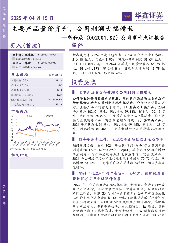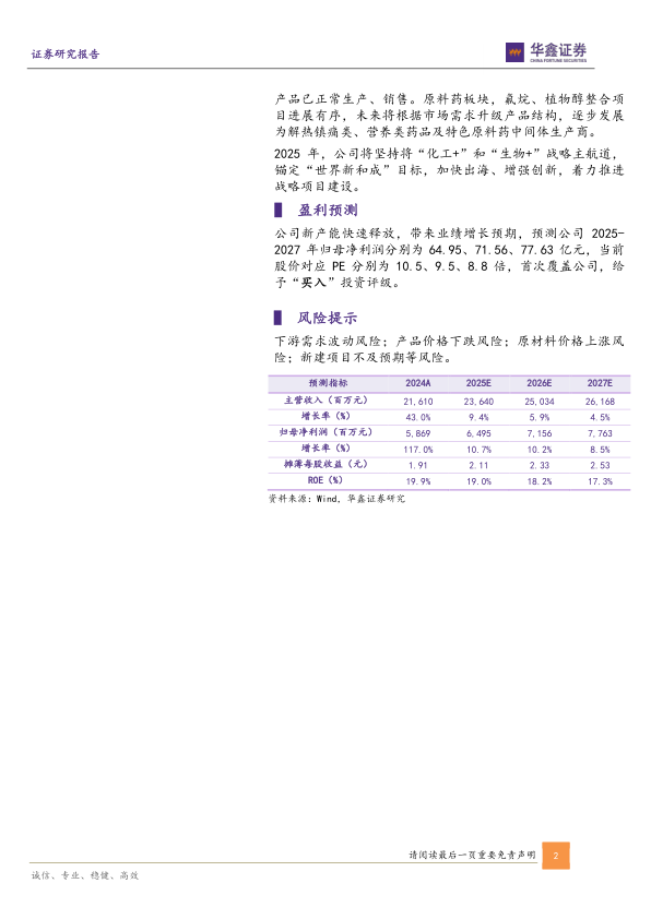 公司坚定“化工+”与“生物+”双主航道战略,通过精细化运营现有产品,并有序推进新项目和新产品的开发建设,持续增强市场竞争力。蛋氨酸、香精香料、新材料和原料药等多个业务板块均取得积极进展,为公司未来的持续增长奠定了坚实基础,分析师首次覆盖并给予“买入”评级。