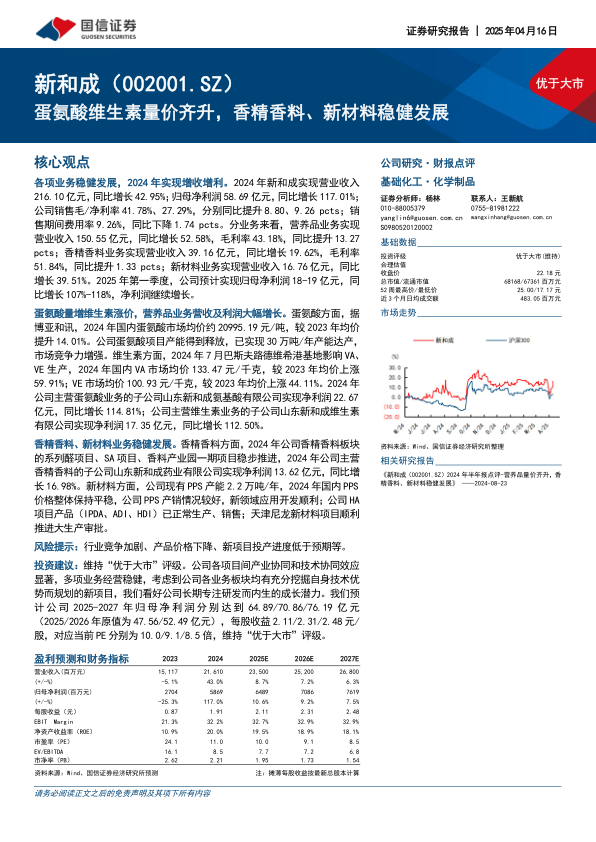香精香料、新材料业务稳健发展。香精香料方面,2024年公司香精香料板块的系列醛项目、SA项目、香料产业园一期项目稳步推进,2024年公司主营香精香料的子公司山东新和成药业有限公司实现净利润13.62亿元,同比增长16.98%。新材料方面,公司现有PPS产能2.2万吨/年,2024年国内PPS价格整体保持平稳,公司PPS产销情况较好,新领域应用开发顺利;公司HA项目产品(IPDA、ADI、HDI)已正常生产、销售;天津尼龙新材料项目顺利推进大生产审批。