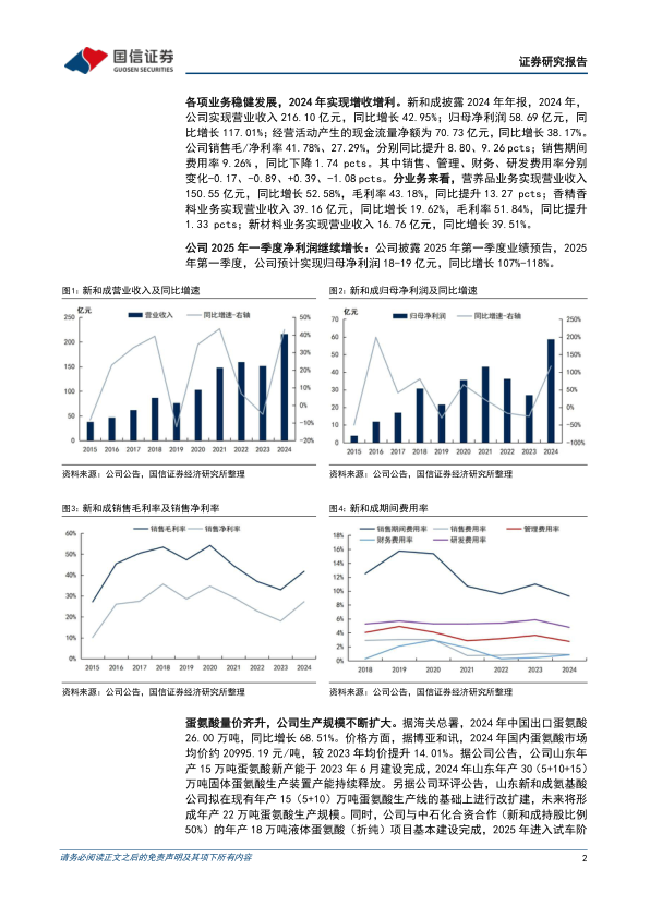 各项业务稳健发展,2024年实现增收增利。2024年新和成实现营业收入216.10亿元,同比增长42.95%;归母净利润58.69亿元,同比增长117.01%;公司销售毛/净利率41.78%、27.29%,分别同比提升8.80、9.26pcts;销售期间费用率9.26%,同比下降1.74pcts。分业务来看,营养品业务实现营业收入150.55亿元,同比增长52.58%,毛利率43.18%,同比提升13.27pcts;香精香料业务实现营业收入39.16亿元,同比增长19.62%,毛利率51.84%,同比提升1.33pcts;新材料业务实现营业收入16.76亿元,同比增长39.51%。2025年第一季度,公司预计实现归母净利润18-19亿元,同比增长107%-118%,净利润继续增长。